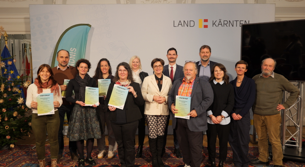 Christian Salmhofer, Geschäftsführer des Klimabündnis Kärnten, sagte ein paar Worte und Elke Müllegger und Petra Obernosterer vom Klimabündnis Kärnten gaben einen kurzen Rückblick auf den Lehrgang, bevor dann Landesrätin Beate Prettner und Landesrat Peter Reichmann die Zertifikate verliehen.